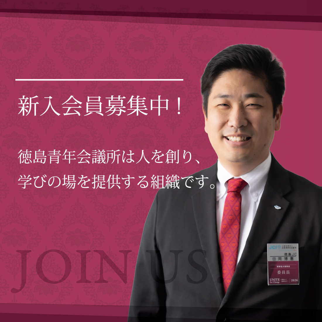 徳島青年会議所は明るい豊かな社会の実現を目指して、25歳から40歳までの青年経済人が地域のために情熱を持って様々な行動を起こしていく団体です。